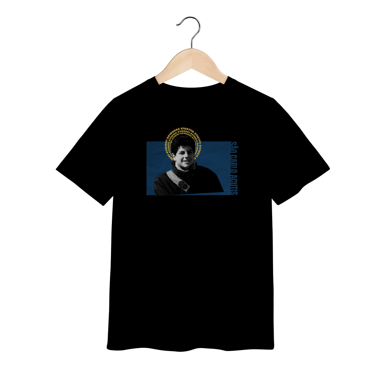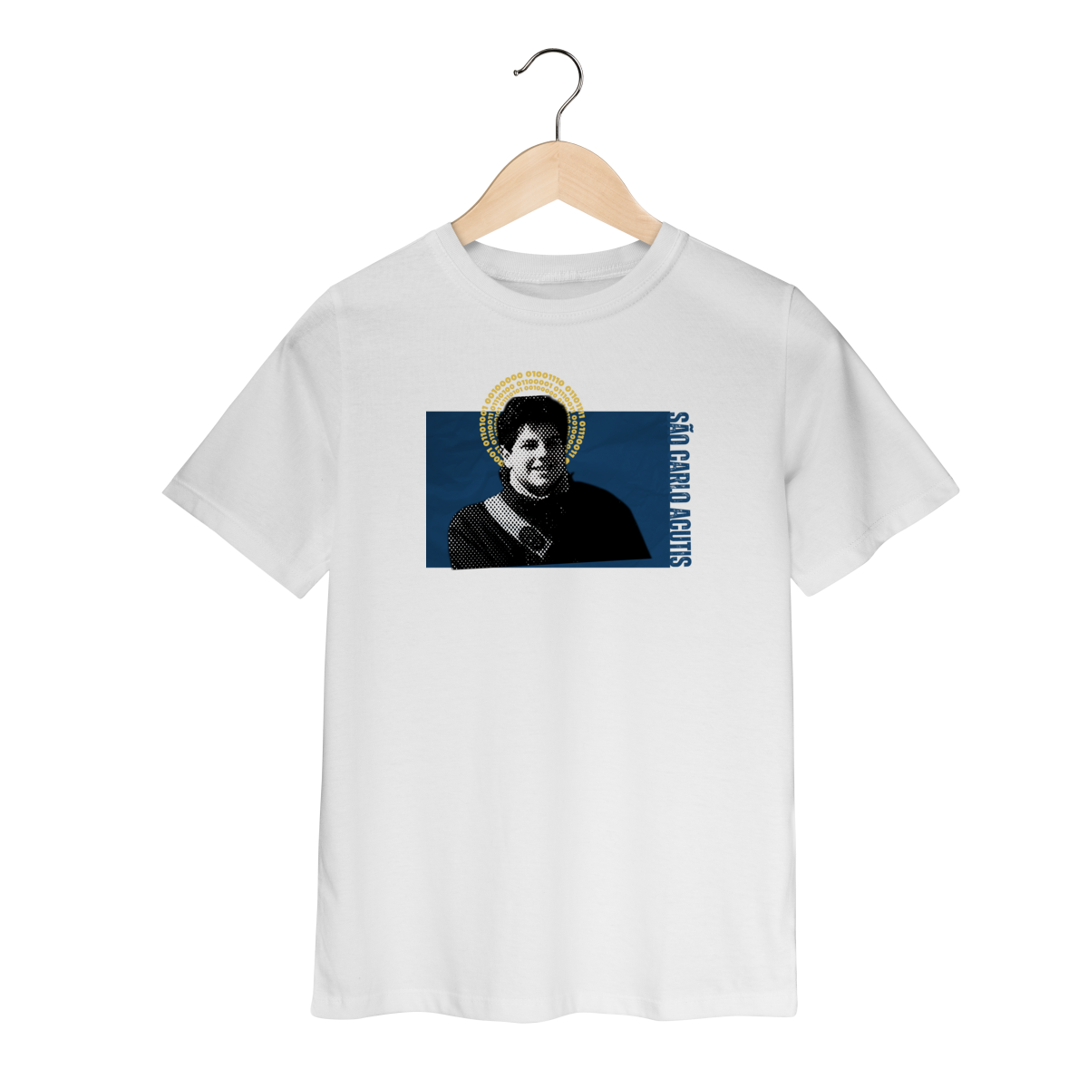Esta camiseta celebra a vida de Carlo Acutis, o jovem santo que uniu a tecnologia à fé, tornando‑se exemplo para gerações.