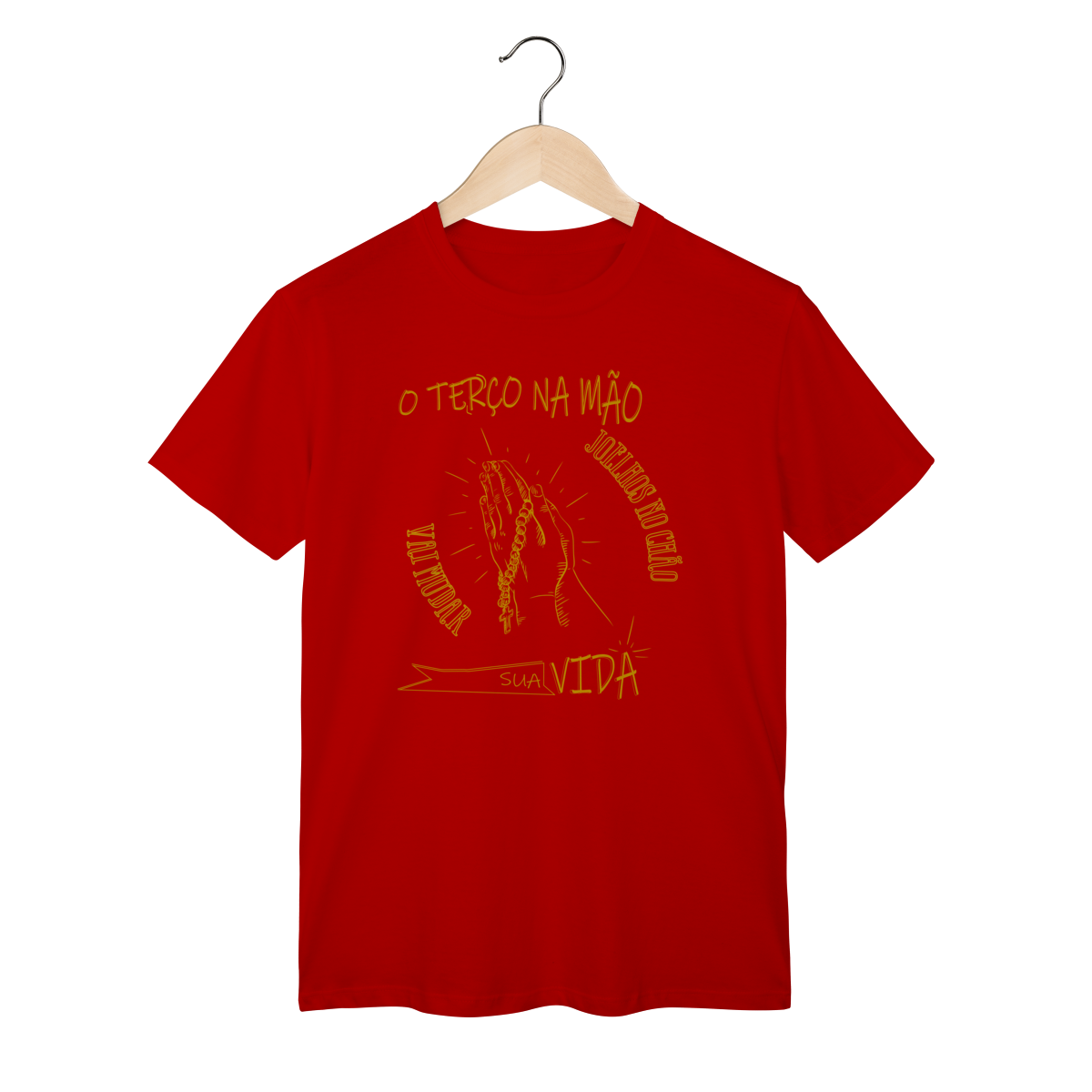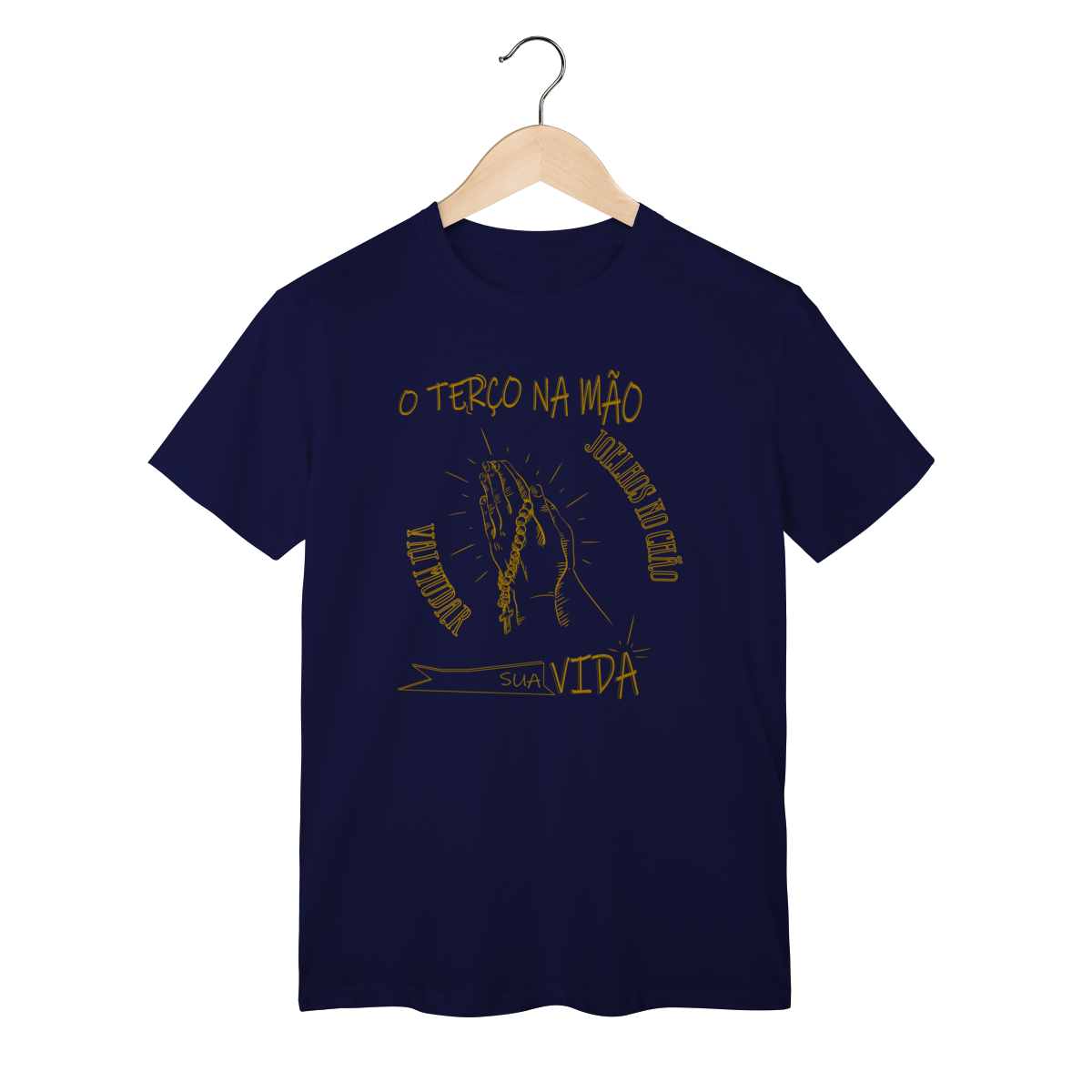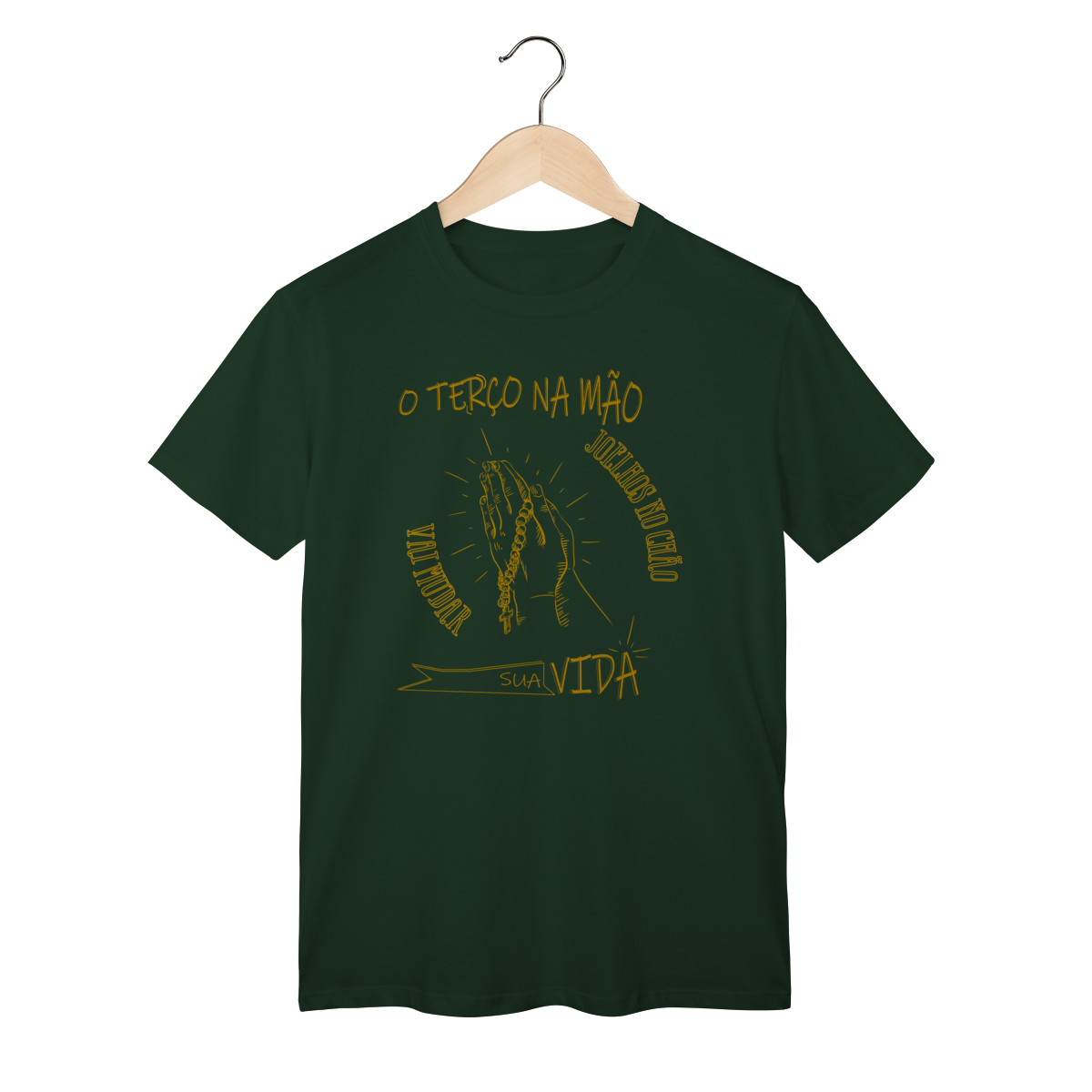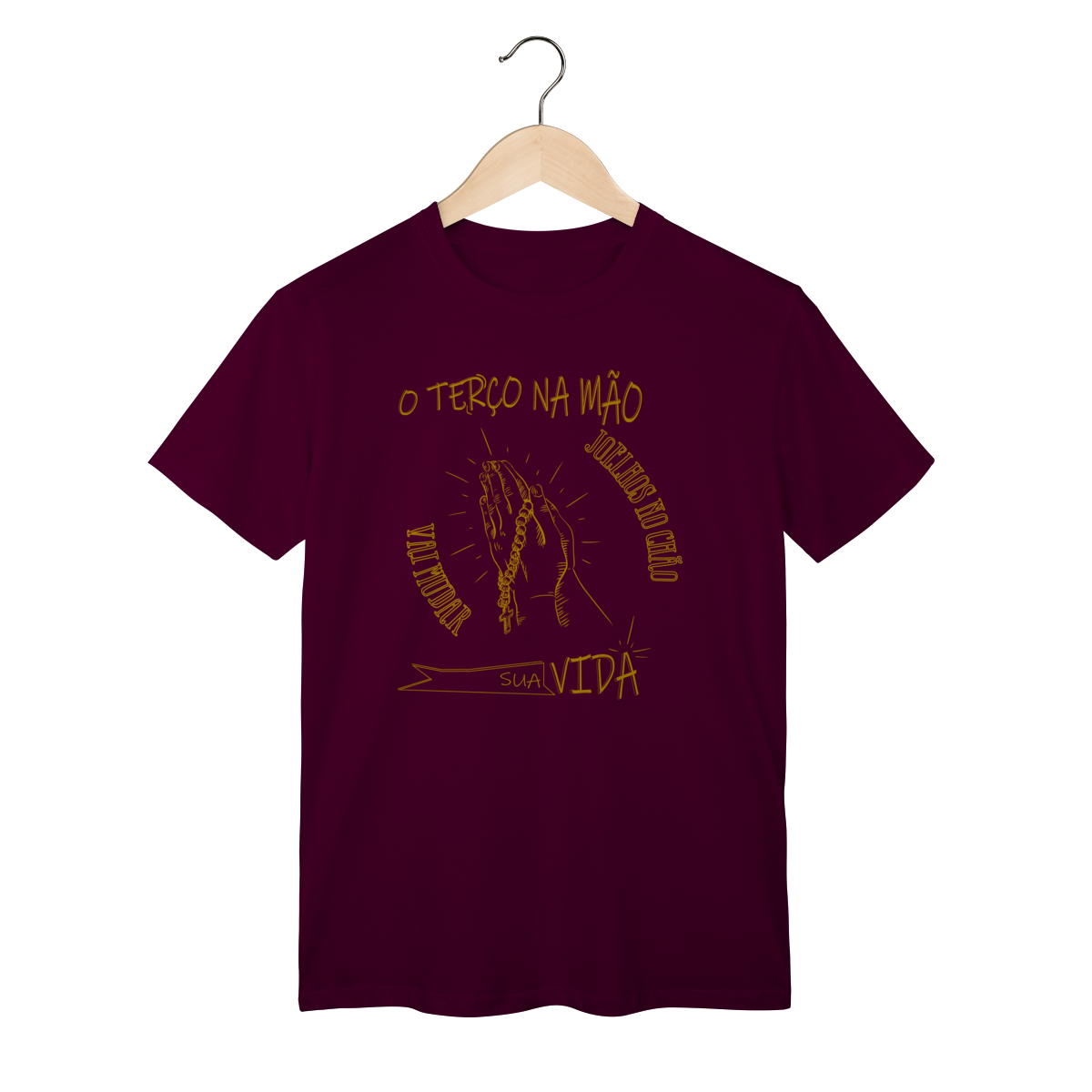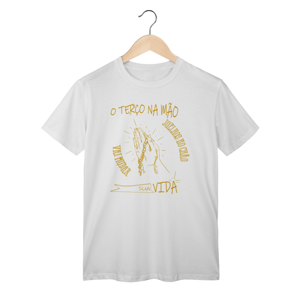 A camiseta “Terço na mão, joelhos no chão, vai mudar sua vida” é um lembrete de que os maiores milagres acontecem quando nos colocamos diante de Deus com fé e humildade.
